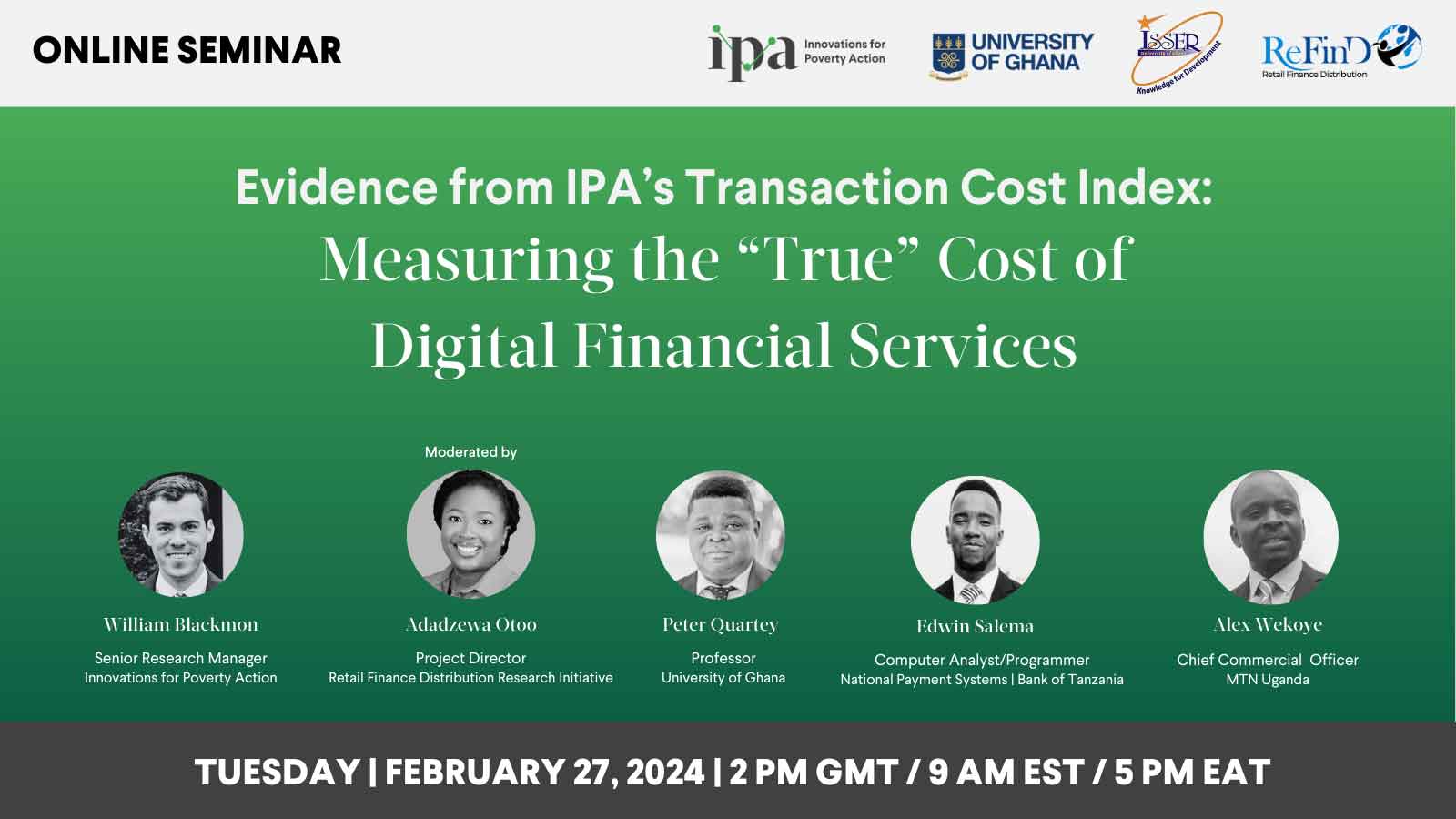 In this seminar, hosted by the Institute of Statistical Social & Economic Research (ISSER), IPA researcher, William Blackmon, will introduce results from the TCI, including a comparison of prices across 16 countries in Africa, Latin America, and Asia, and fieldwork that explores hidden costs in Bangladesh, Tanzania, and Uganda. The seminar will conclude with a panel featuring Professor Peter Quartey (ISSER), Edwin E. Salema (Bank of Tanzania), and Alex Wekoye (MTN Uganda) to discuss the TCI’s implications for regulators, financial service providers, and researchers. The webinar will be moderated by Adadzewa Otoo (ReFinD, ISSER).